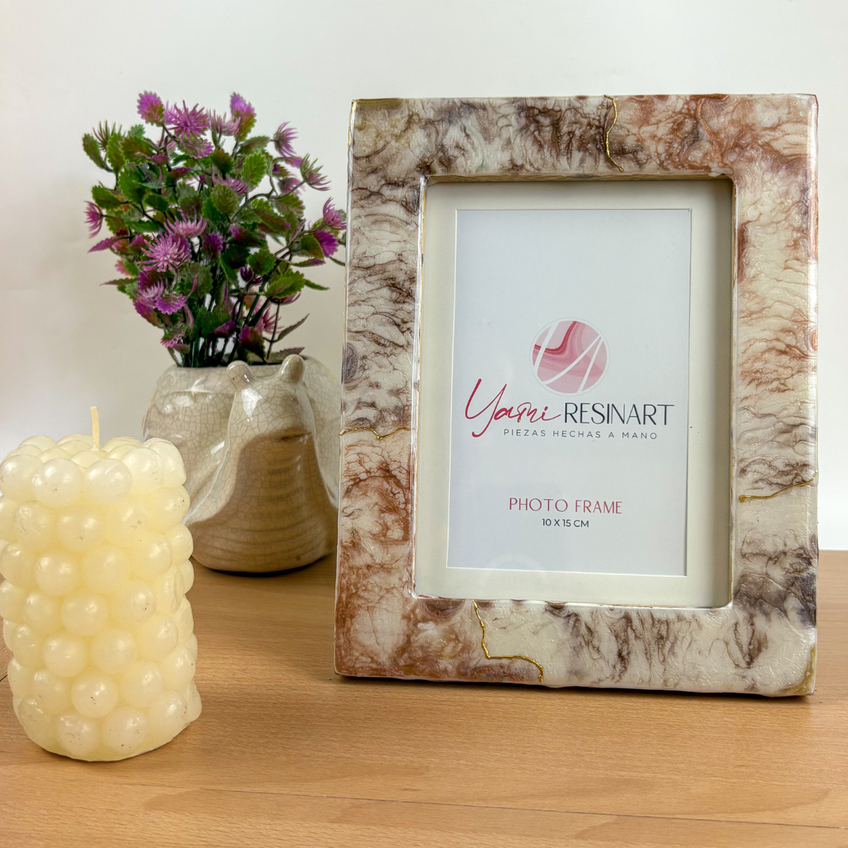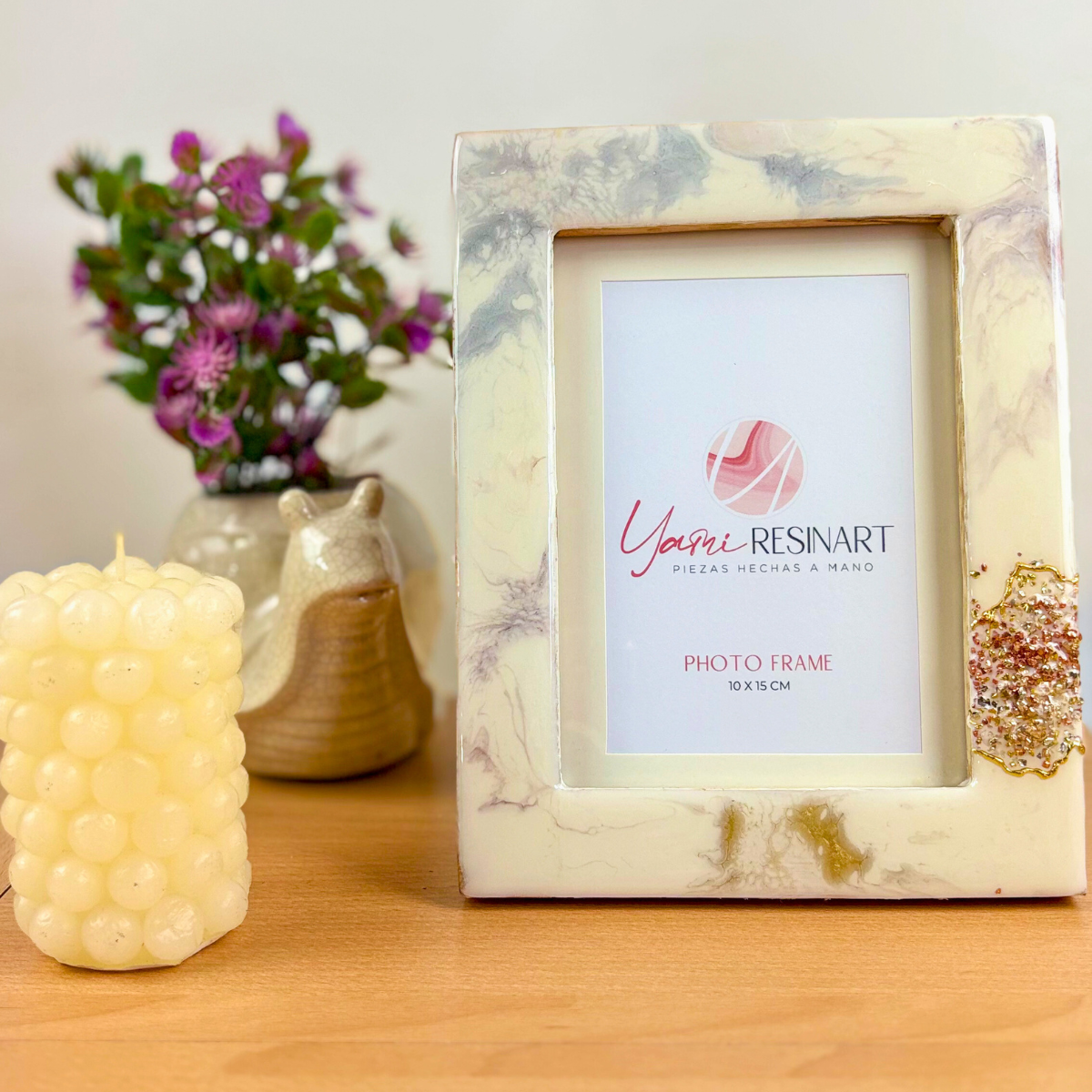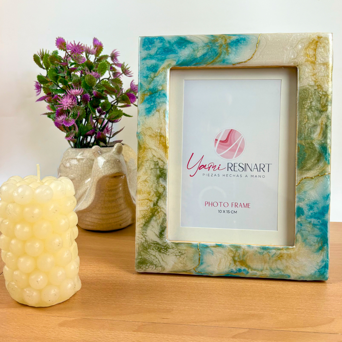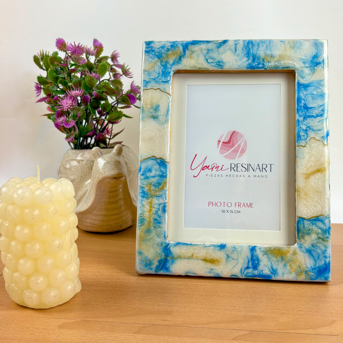 Cada marco de fotos está elaborado a mano en resina artística, creando piezas únicas que convierten cualquier fotografía en un elemento decorativo especial.